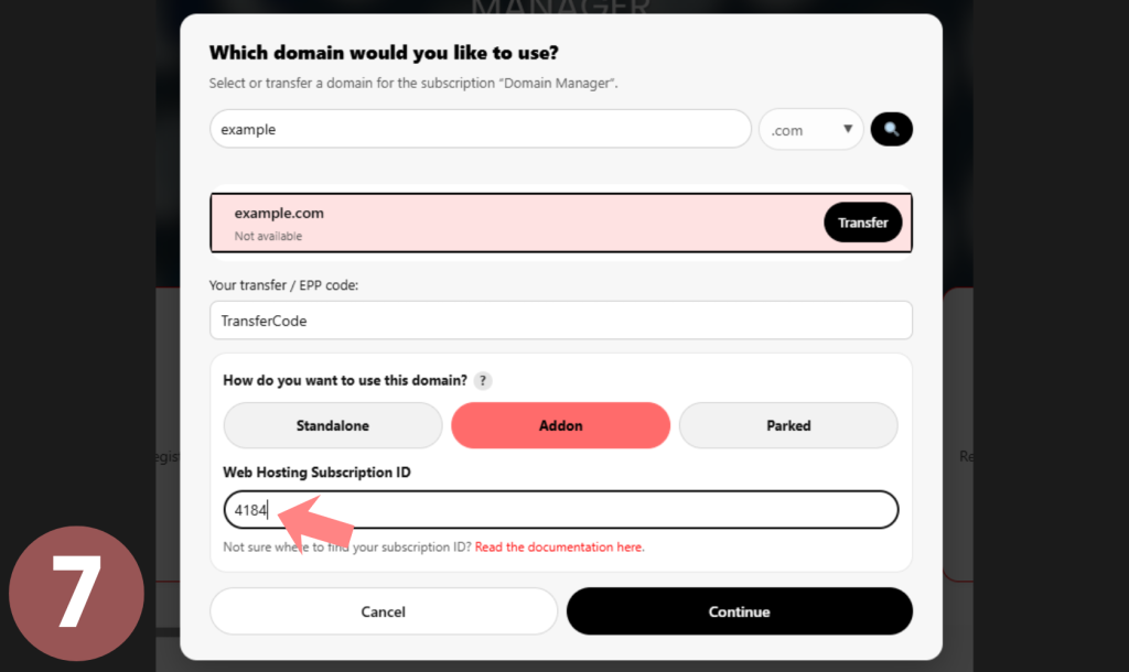 When choosing Addon Domain or Parked Domain, you must enter the Subscription ID of the web/site hosting subscription where the domain should be connected.