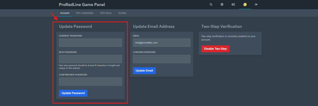 Follow these steps to change your Game Panel password: